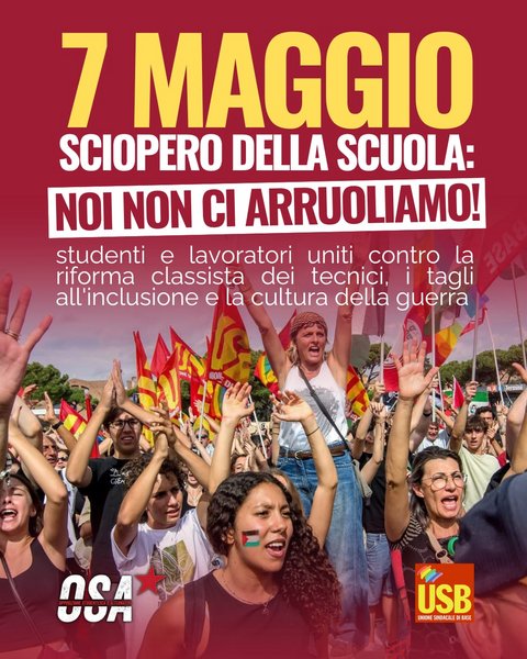 USB Scuola e OSA rivendicano la loro alleanza come scelta strategica, non come gesto simbolico. L'unità tra lavoratori della scuola e studenti è la forza del nostro progetto, perché la scuola è attraversata dalle stesse contraddizioni che attraversano tutta la società: sfruttamento, precarietà, militarizzazione, subalternità al capitale. Resistere insieme, dentro e fuori le aule, è l'unica risposta all'altezza del nostro presente.