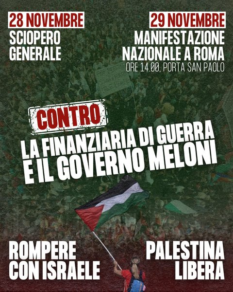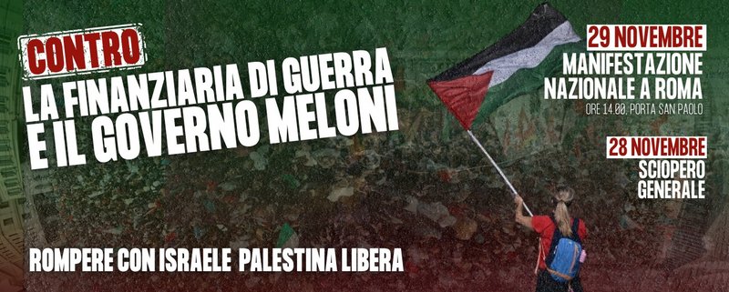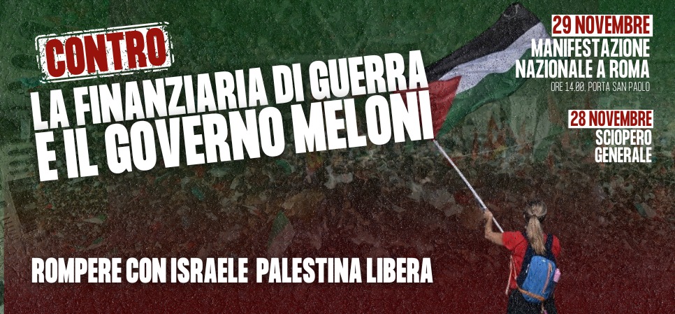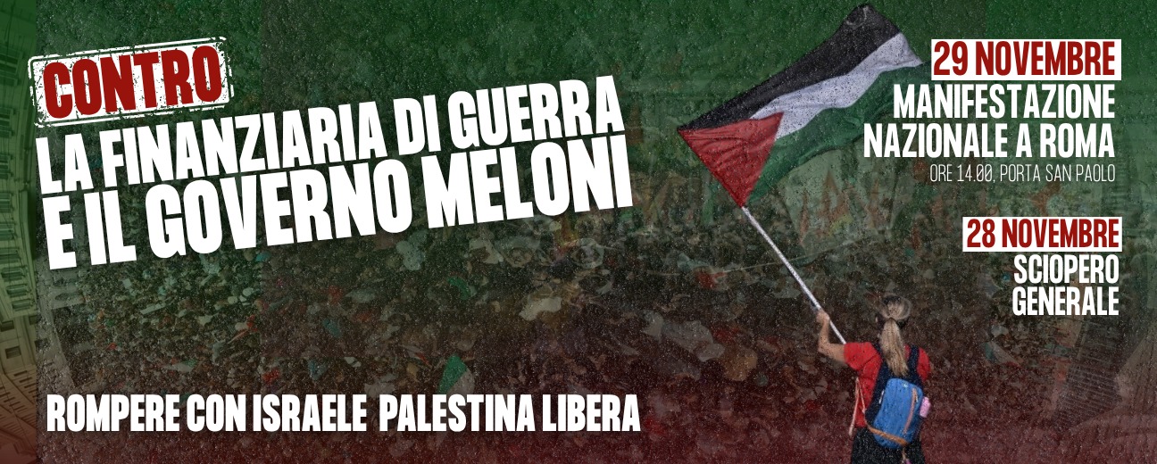 Contro la finanziaria di guerra e il Governo Meloni, rompere con Israele, Palestina libera: 28 novembre Sciopero Generale, 29 novembre manifestazione nazionale a Roma ore 14.00 Porta San Paolo