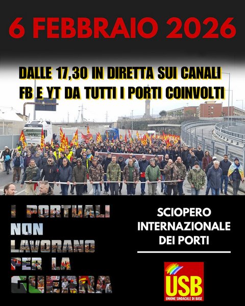 Nella giornata di domani, 6 febbraio 2026, saremo in collegamento con i porti e i lavoratori e le lavoratrici protagonisti dello sciopero internazione dei porti lanciato dall' Unione Sindacale di Base e molte altre sigle sindacali internazionali. dalle ore 17:30 troverete la nostra diretta online sui nostri canali ufficiali di Youtube e Facebook.