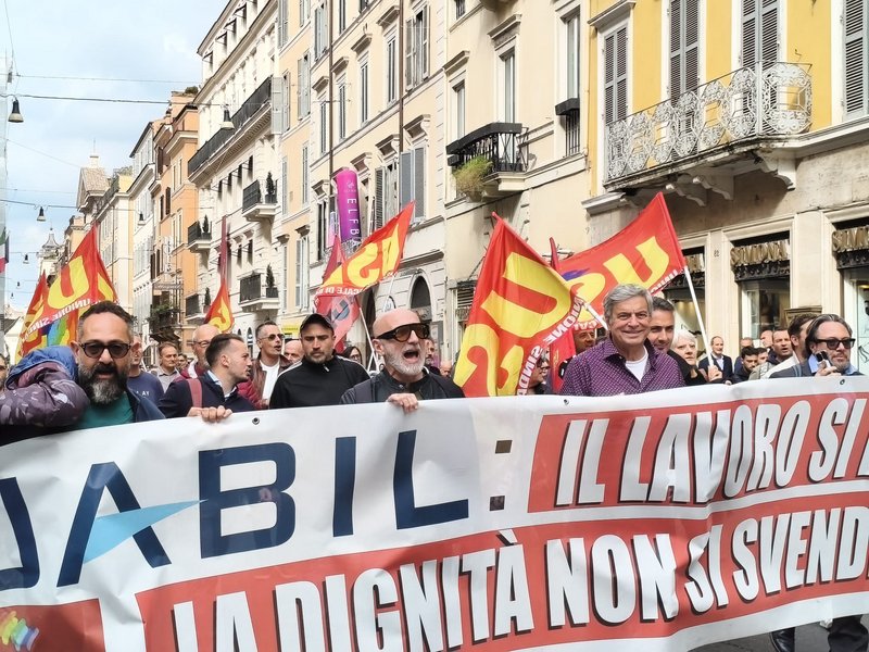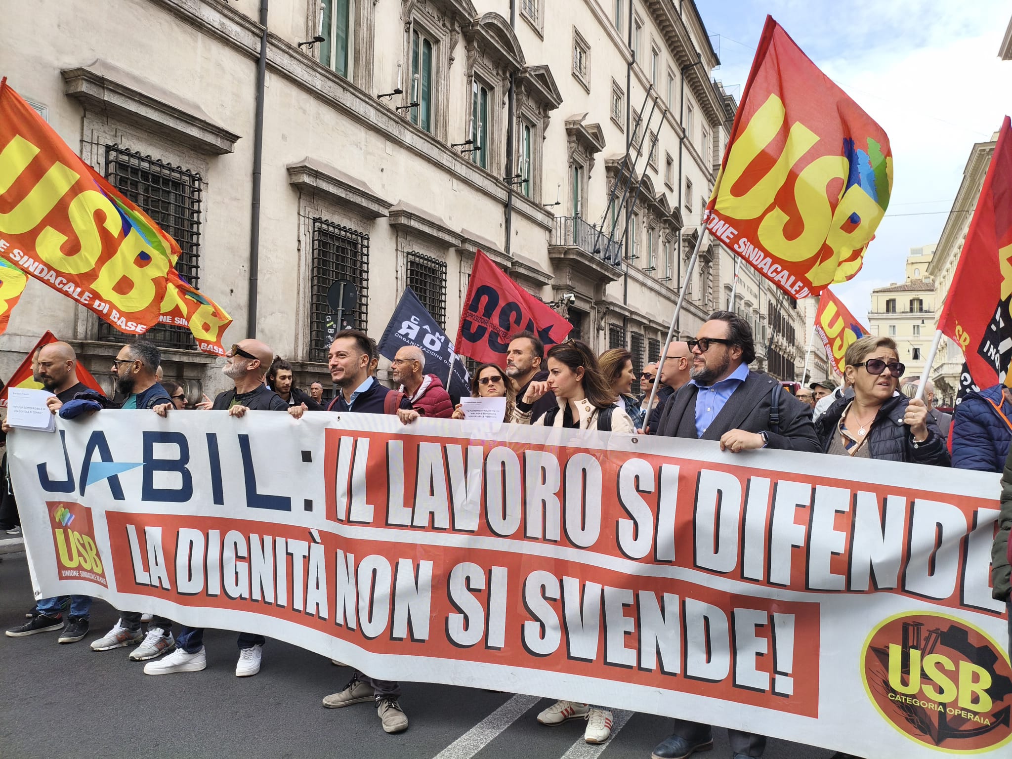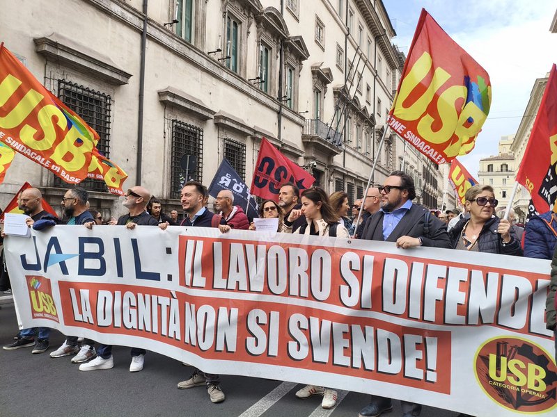 Si è svolta oggi a Roma la manifestazione nazionale delle lavoratrici e dei lavoratori Jabil, che hanno attraversato le vie principali della Capitale – da Piazza del Popolo fino a Palazzo Chigi, passando per via del Corso – portando la loro rabbia e la loro dignità nelle strade dello shopping e del potere.