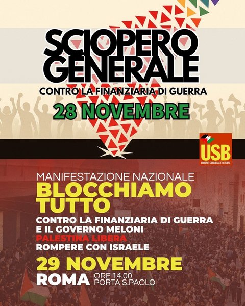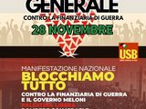 Sulla Piattaforma contro la finanziaria di guerra e il governo Meloni, l’USB lancia un piano di mobilitazione per tutto il mese di novembre e propone ai movimenti sociali e alle realtà indipendenti di costruire una grande mobilitazione nazionale per il sabato 29 novembre. È ora di riprendere la pratica del Blocchiamo tutto, utilizzata efficacemente in difesa del popolo palestinese, contro il genocidio e a sostegno della Global Sumud Flotilla, per fermare la corsa al riarmo e costruire un nuovo futuro.