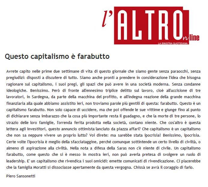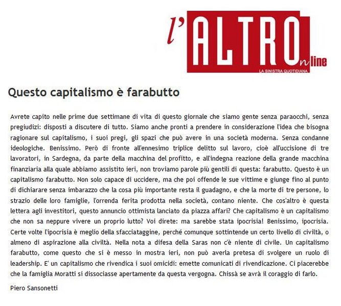 "…di fronte all'ennesimo triplice delitto sul lavoro, cioè all'uccisione di tre lavoratori, in Sardegna, da parte della macchina del profitto, e all'indegna reazione della grande macchina finanziaria alla quale abbiamo assistito ieri, non troviamo parole più gentili di questa: farabutto. Questo è un capitalismo farabutto. Non solo capace di uccidere, ma che poi offende le sue vittime e giunge fino al punto di dichiarare senza imbarazzo che la cosa più importante resta il guadagno, e che la morte di tre persone, lo strazio delle loro famiglie, l'orrenda ferita prodotta nella società, contano niente. Che cos'altro è questa lettera agli investitori, questo annuncio ottimista lanciato da piazza affari? Che capitalismo è un capitalismo che non sa neppure vivere un proprio lutto? Voi direte: ma sarebbe stata ipocrisia! Benissimo, ipocrisia. Certe volte l'ipocrisia è meglio della sfacciataggine, perché comunque sottintende un certo livello di civiltà, o almeno di aspirazione alla civiltà. Nella nota a difesa della Saras non c'è niente di civile. Un capitalismo farabutto, come questo che si è messo in mostra ieri, non può averla pretesa di svolgere un ruolo di leadership. E' un capitalismo che rivendica i suoi omicidi: emette comunicati di rivendicazione. Ci piacerebbe che la famiglia Moratti si dissociasse apertamente da questa vergogna. Chissà se avrà il coraggio di farlo."