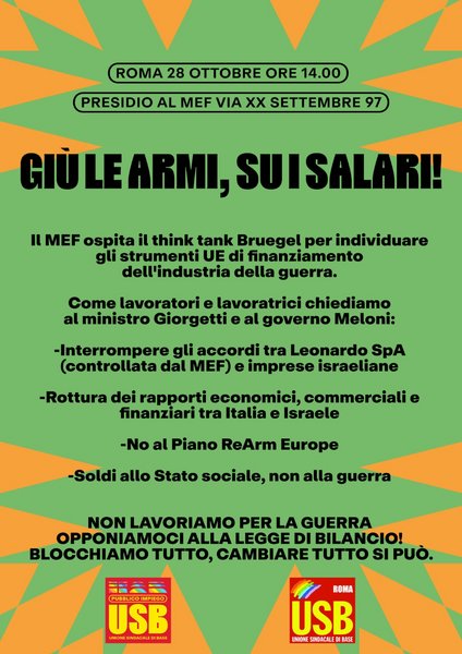 28 ottobre presidio al MEF: no alla finanza di guerra, soldi allo stato sociale! Rottura immediata dei rapporti con Israele