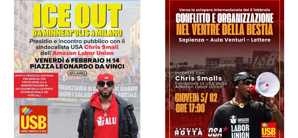 - il 5 febbraio incontro con il sindacalista Amazon Chris Small alle ore 17.00 presso l’aula Venturi della facoltà di Lettere dell’Università della Sapienza a Roma;
