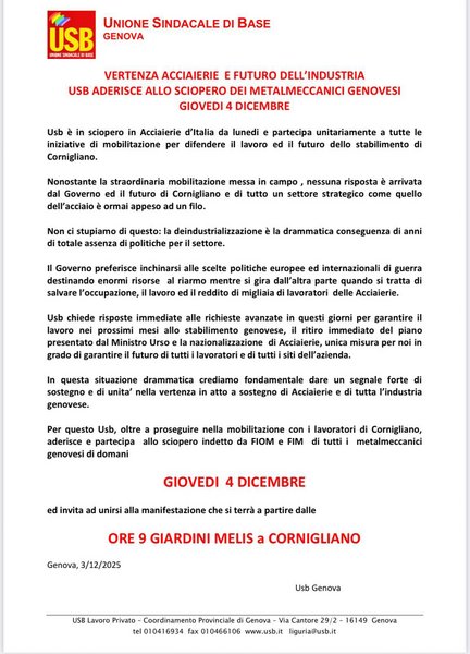 Per questo Usb, oltre a proseguire nella mobilitazione con i lavoratori di Cornigliano, aderisce e partecipa allo sciopero indetto da FIOM e FIM di tutti i metalmeccanici genovesi di domani (giovedì 4 dicembre) ed invita ad unirsi alla manifestazione che si terrà a partire dalle ore 9 presso i Giardini Melis a Cornigliano.